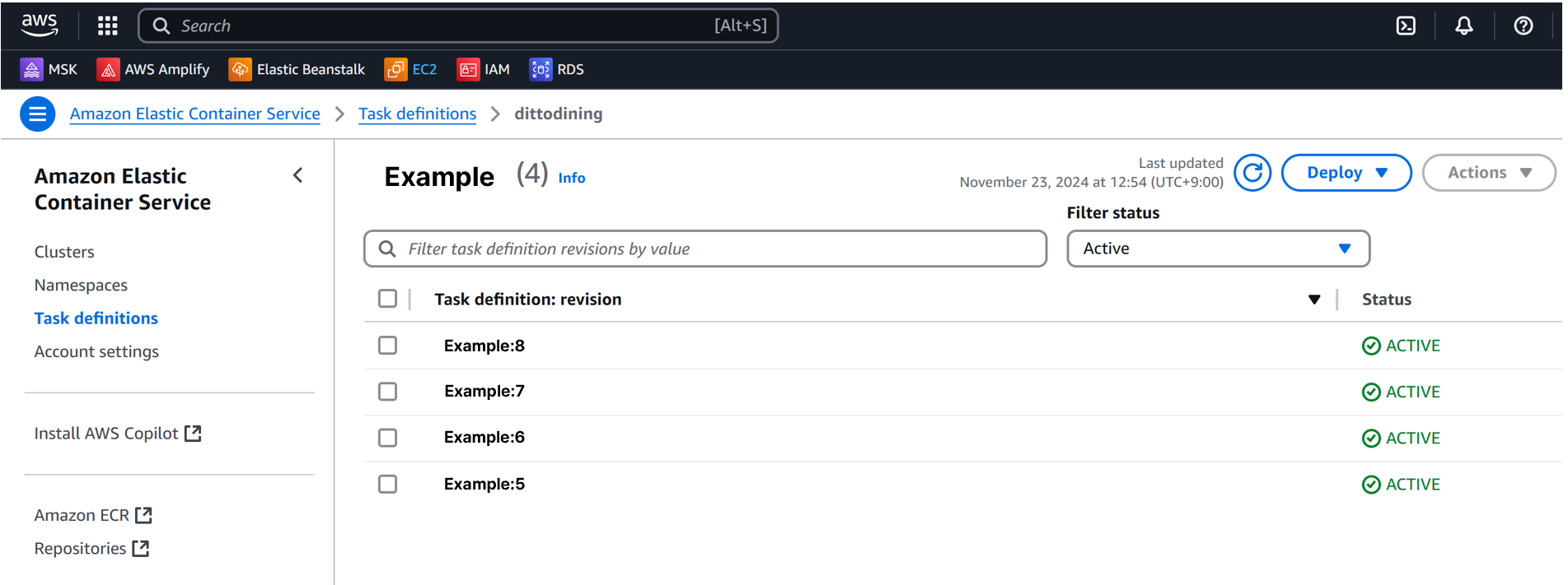 - Task : Task Definition에 의해 배포된 컨테이너 Set입니다.