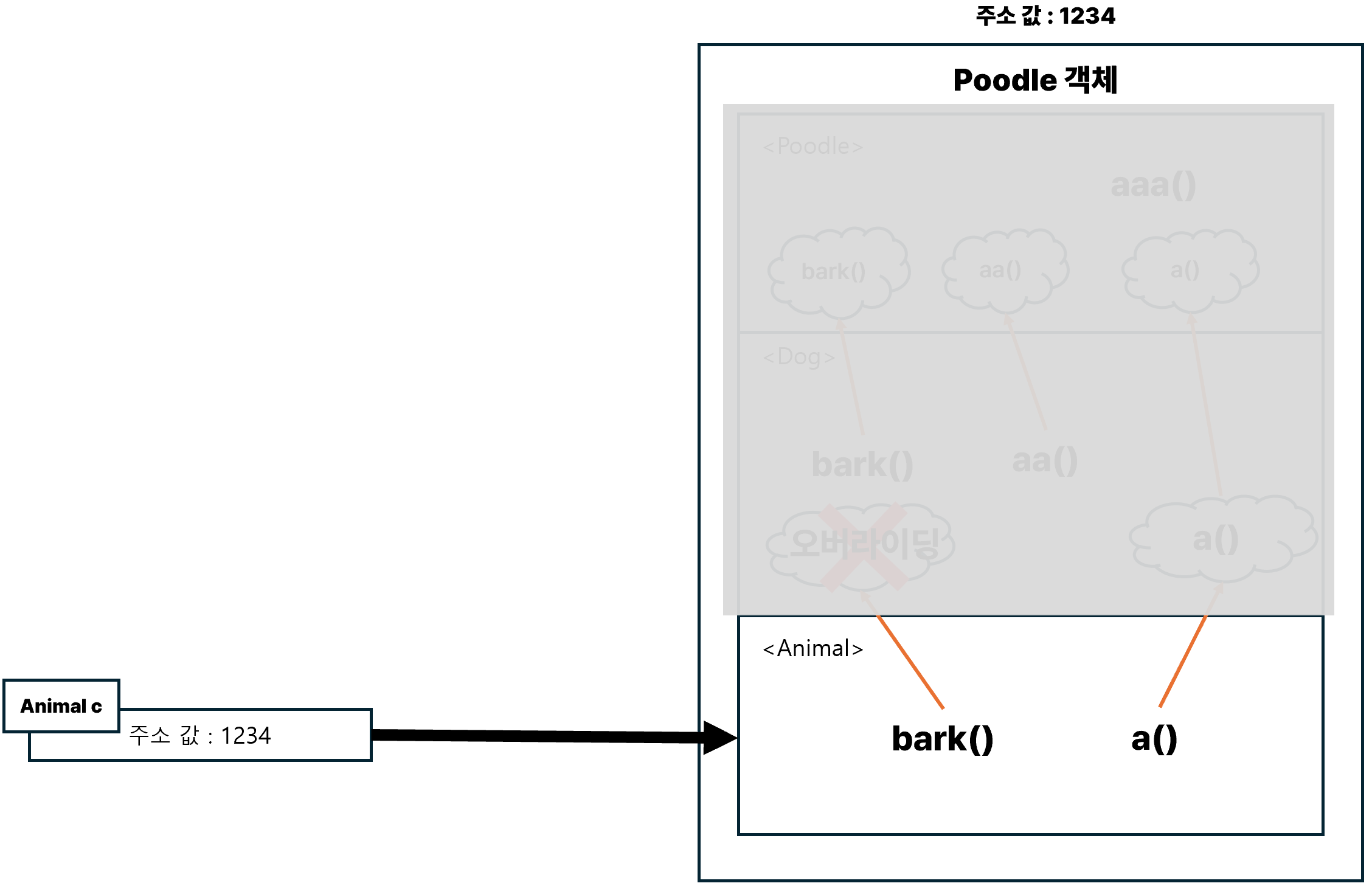 위의 그림을 보면서 각 Poodle a, Dog b, Animal c 라는 변수가 Poodle 객체를 어떻게 바라보고 있는지 하나씩 살펴보겠습니다.