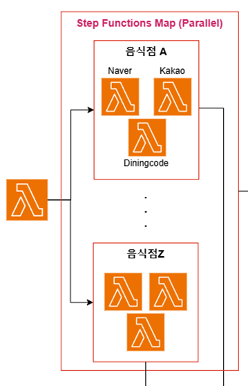 이러한 Timeout 문제를 해결하기 위해 각 플랫폼 별로 하나의 음식점 정보를 크롤링하는 Lambda를 구성하고, 음식점의 개수만큼 Lambda의 수를 늘리는 방법을 선택했습니다.