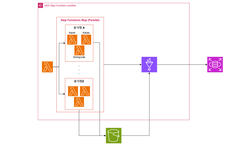- L : 크롤링한 음식점 데이터를 플랫폼, 음식점별로 S3에 저장.