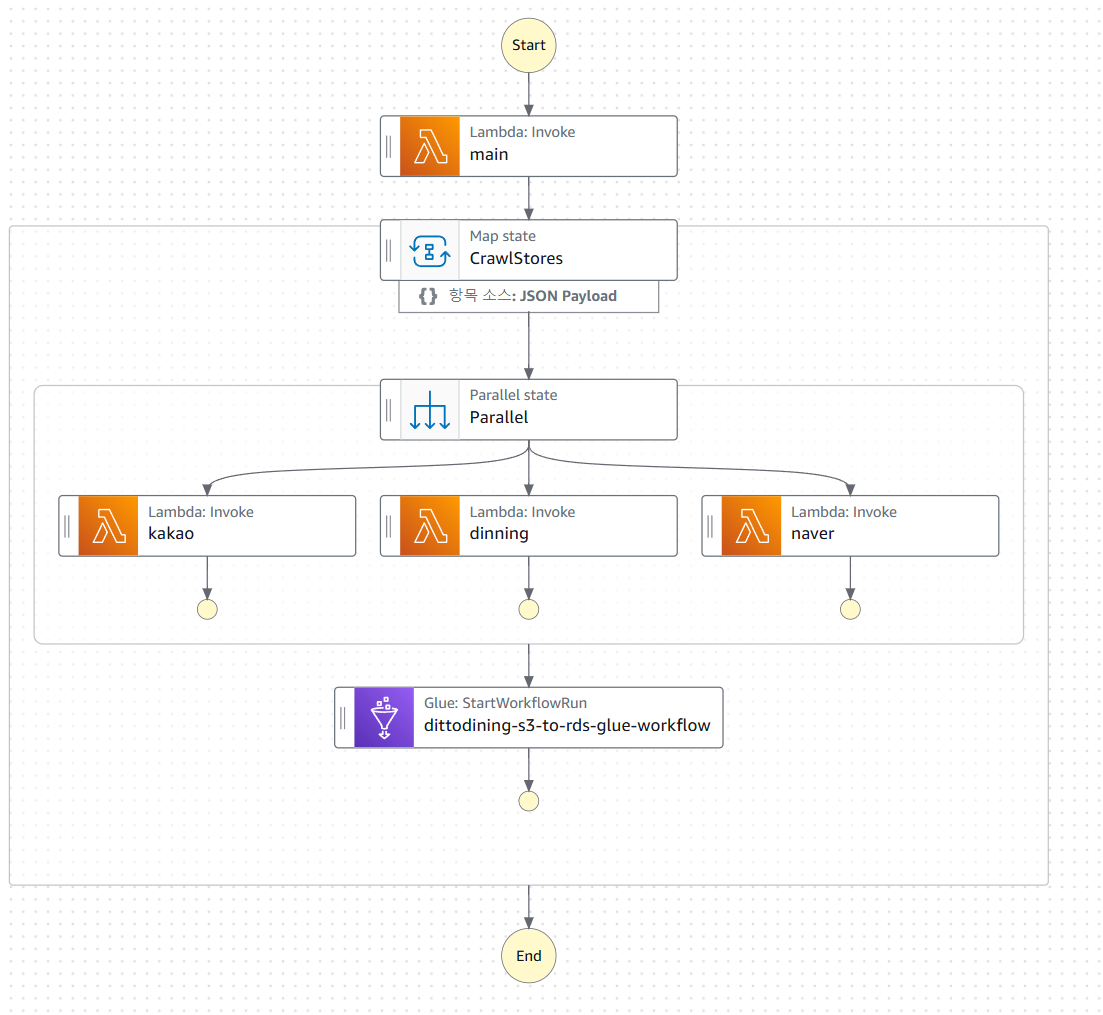 Lambda의 모든 작업이 완료된 후, Glue를 활용하여 플랫폼별로 저장된 음식점 정보를 전처리하고 하나의 음식점 단위로 통합하는 작업을 수행하였습니다. 또한, 통합된 데이터가 RDS에 올바른 순서로 적재될 수 있도록 Glue Workflow를 구성하였습니다.