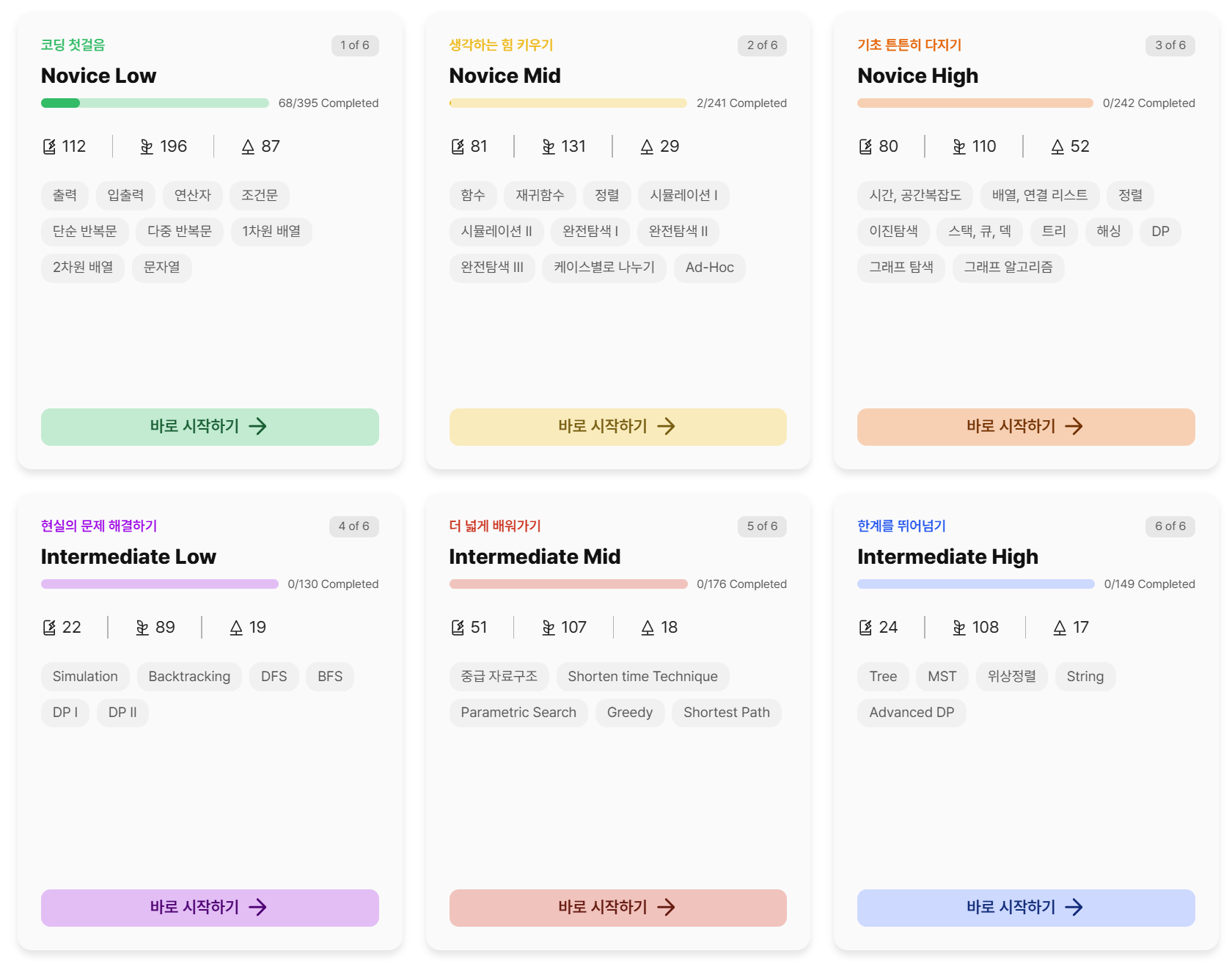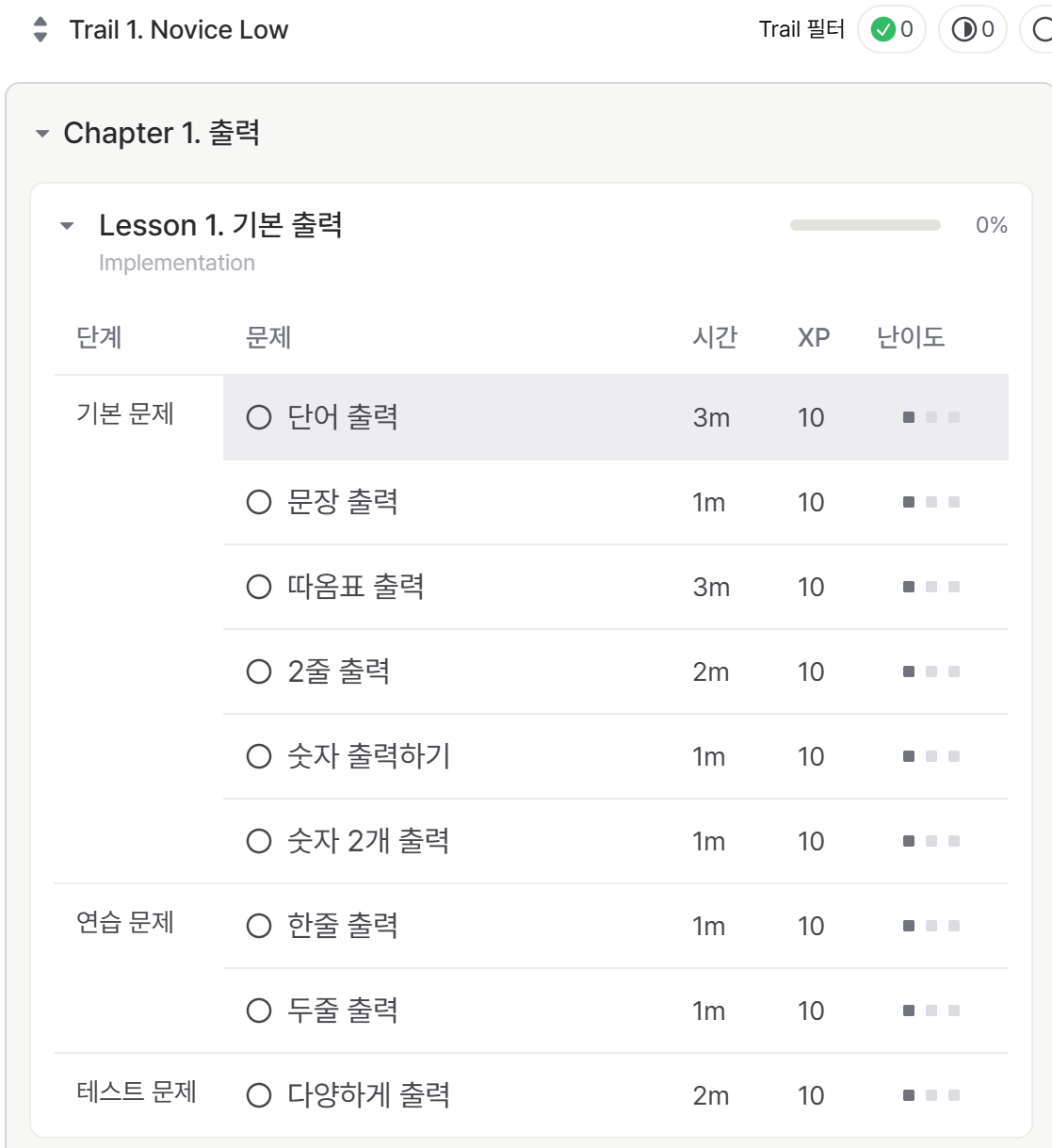코드트리에는 정말 많은 문제가 있습니다. 처음에는 Novice Low부터 Novice High까지 푸는 것을 한 달 목표로 삼았지만, Novice Low 문제만 해도 너무 많아서 깜짝 놀랐습니다. 덕분에 공부하다가 부족한 개념이 있다면 다양한 응용 문제로 반복 연습하며 자연스럽게 체득할 수 있었습니다.