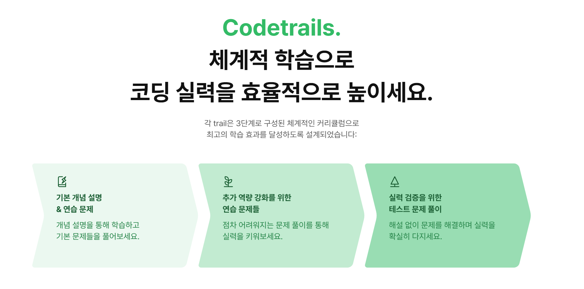 코드트리는 코딩테스트를 준비하는 학생, 취준생, 이직자를 위한 학습 커리큘럼 및 실력진단 서비스를 제공하는 코딩테스트 학습 플랫폼입니다. 최근 리뉴얼을 통해 더욱 깔끔한 UI와 체계적인 커리큘럼을 갖추어, 사용자가 효과적으로 학습하고 실력을 향상할 수 있도록 도와줍니다.