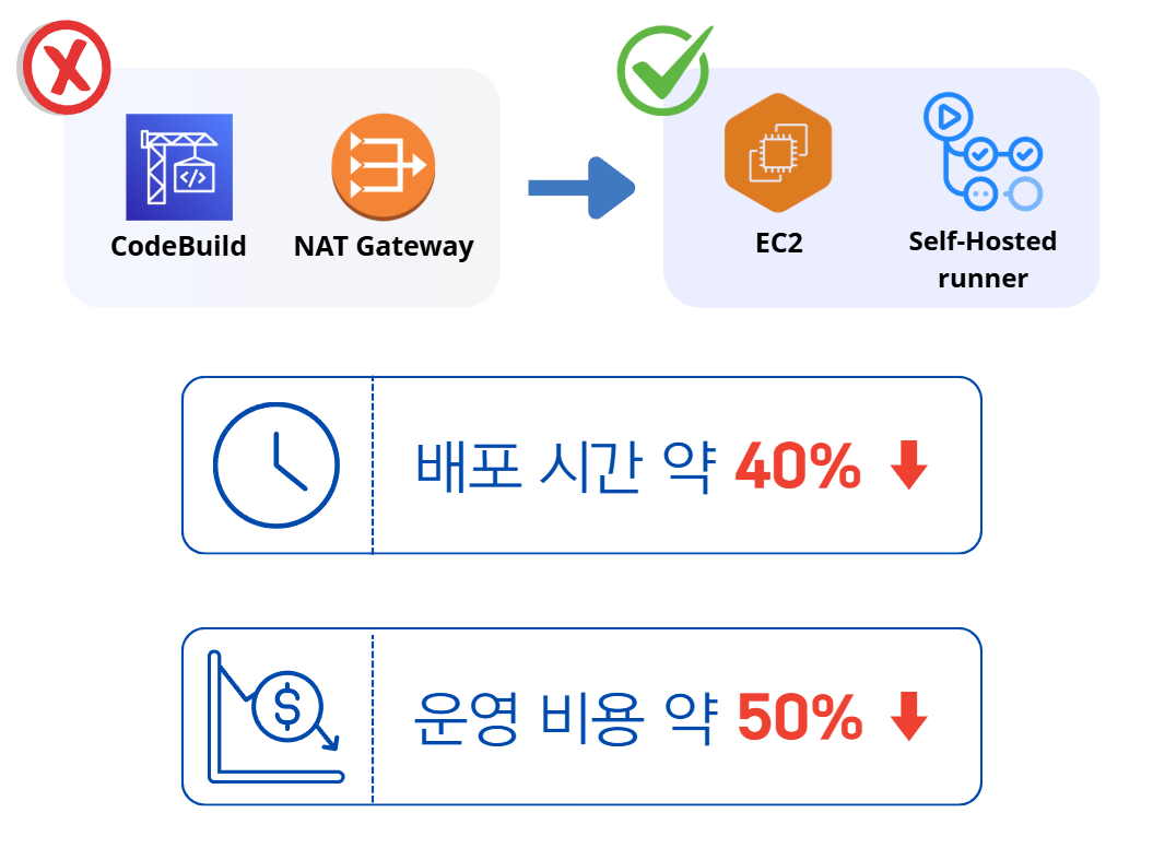 이러한 이유들로 기존의 AWS CodeBuild를 이용한 CI/CD 파이프라인에서 Github Actions Self-Hosted Runner를 이용한 CI/CD 파이프라인으로 전환하기로 결정했습니다.