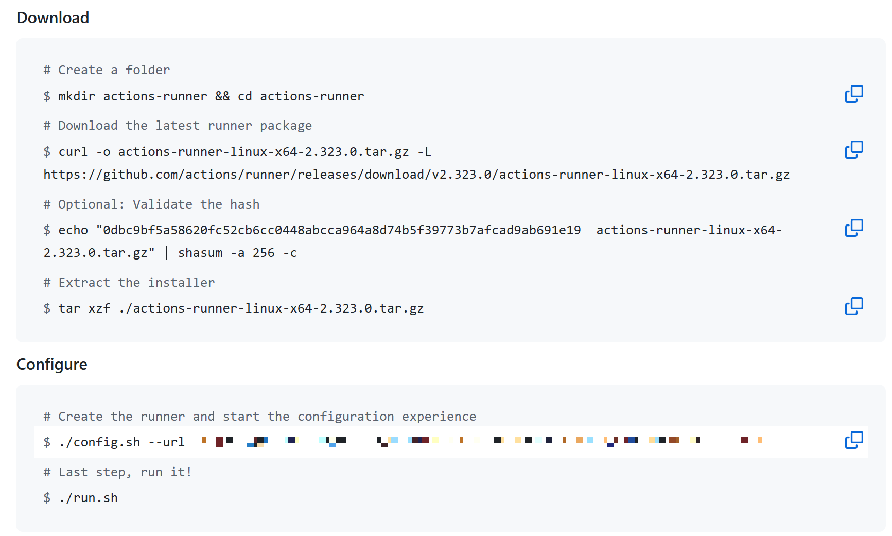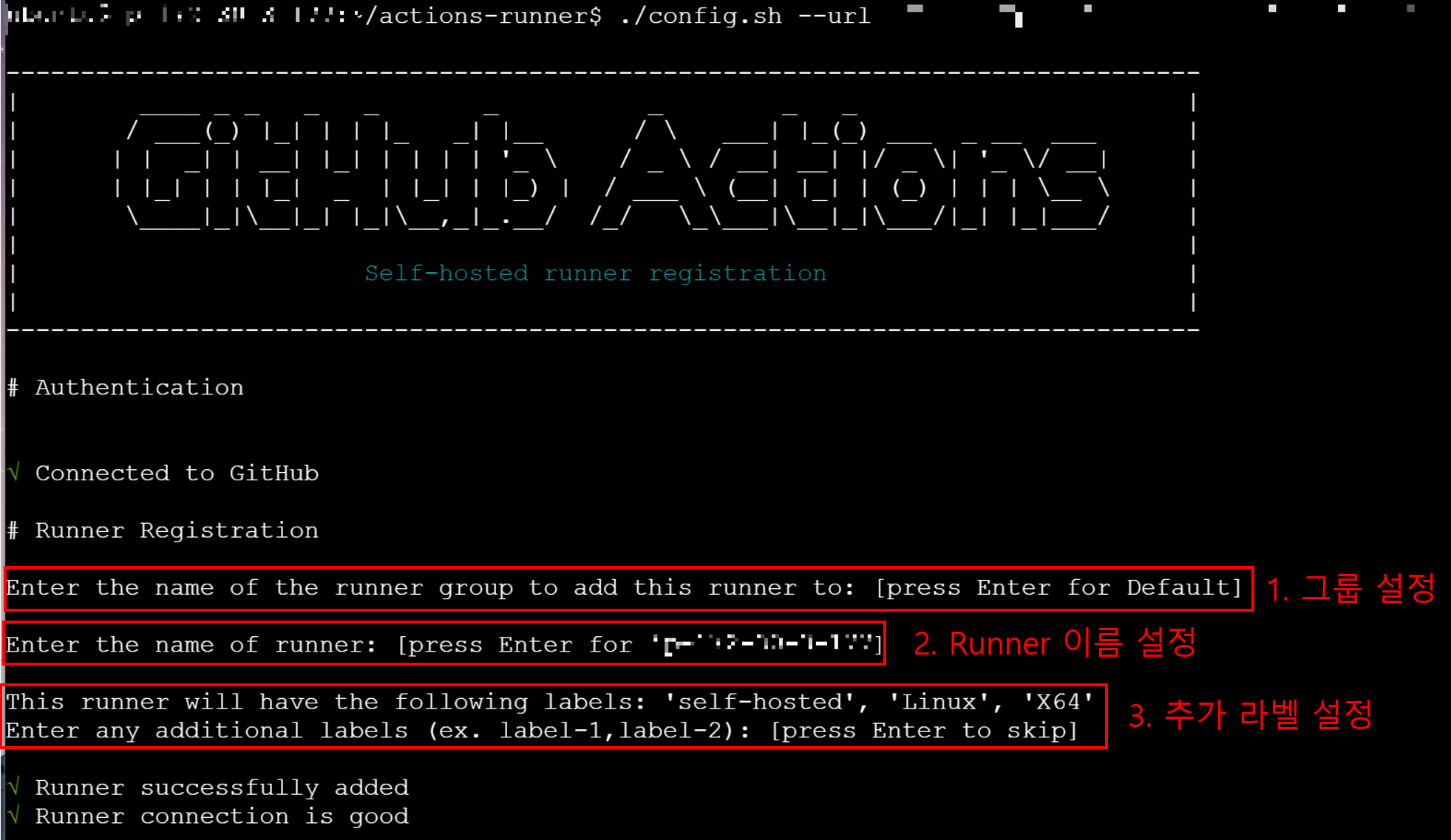 특히 ./config.sh --url ~ 명령어 실행 시 아래와 같은 설정 과정이 진행됩니다.