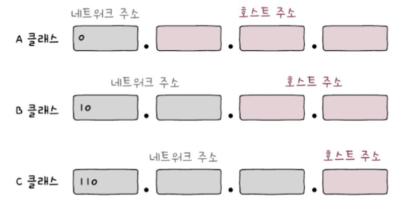 - A, B, C 클래스는 네트워크의 크기를 나누는 데에 실질적으로 사용된다. (D클래스는 멀티 캐스트를 위한 클래스, E 클래스는 특수한 목적을 위해 예약된 클래스)
