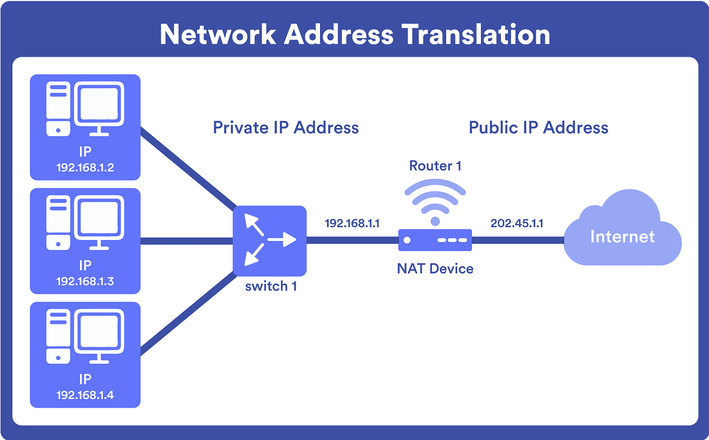 - NAT는 네트워크 내부에서 사용되는 사설 IP 주소를 네트워크 외부에서 사용되는 공인 IP 주소를 변환하는데 사용된다.