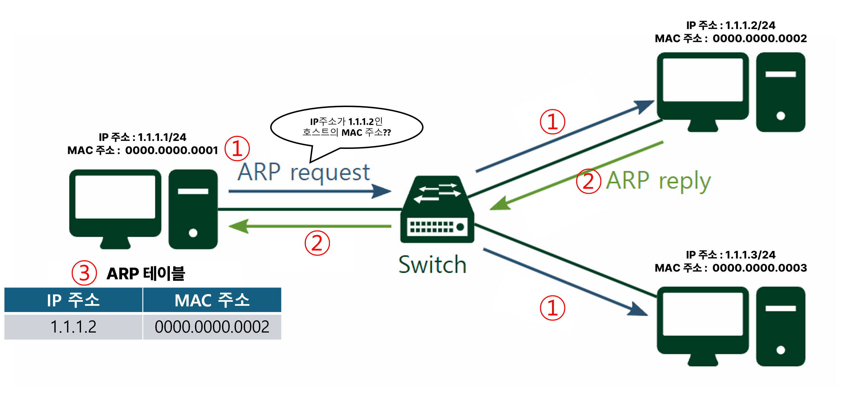- ARP 테이블 갱신 : 모든 호스트는 ARP 테이블이라는 IP 주소와 그에 맞는 MAC 주소를 대응하는 표를 유지하는데, 송신자는 응답받은 MAC 주소를 ARP 테이블에 저장