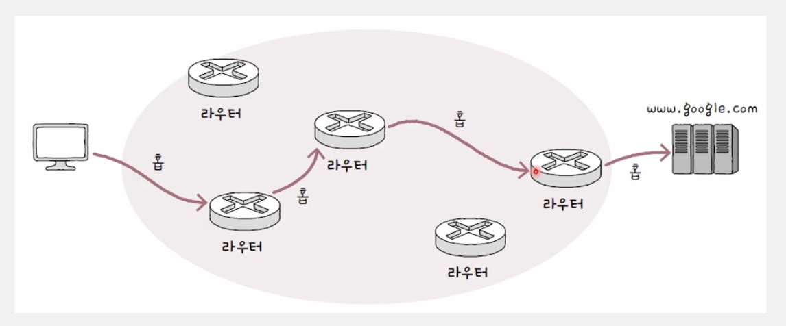 - 멀리 떨어져 있는 호스트 간의 통신 과정에서 패킷은 여러 라우터를 거쳐서 다양한 경로로 이동하며, 라우터와 라우터 간 하나의 과정을 홉(hop)이라고 부른다.