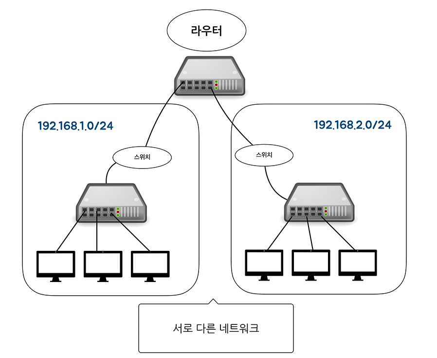 - 일반적으로 같은 라우터의 동일 인터페이스(또는 포트)에 연결된 장치들은 같은 네트워크에 속한다.
