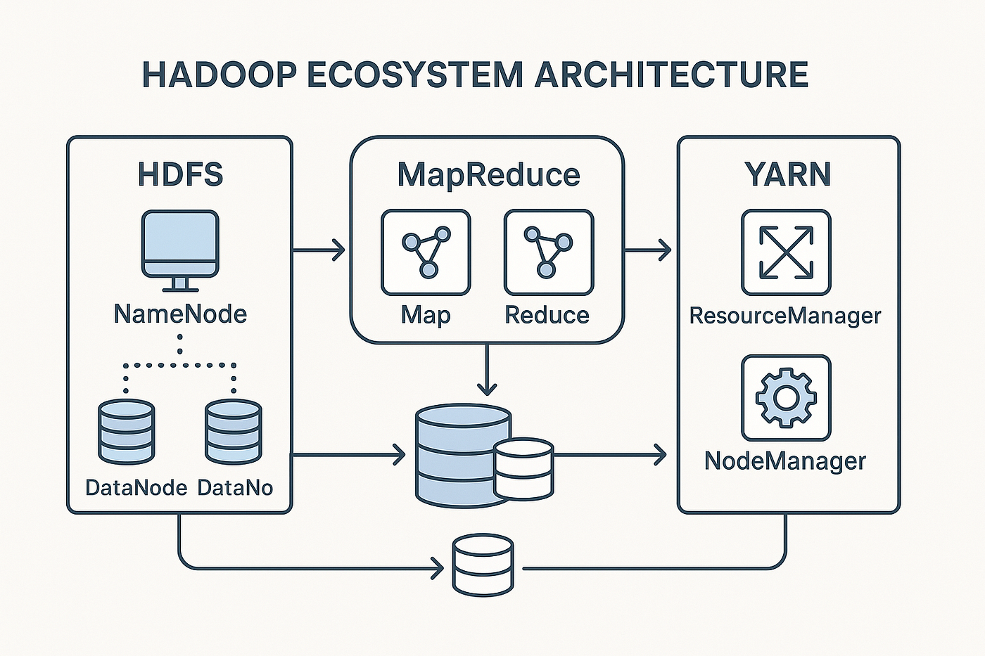 애플리케이션은 NameNode와 통신하여 파일 생성 및 메타데이터 관리를 요청하고, 실제 데이터는 NameNode가 결정한 DataNode들에 블록 단위로 분산 저장됩니다. 이후 데이터를 조회하거나 처리하기 위해 여러 맵으로 구성된 MapReduce 작업을 제출하면, 여러 Mapper와 Reducer 태스크가 DataNode에 분산 저장된 HDFS 데이터를 대상으로 병렬 실행됩니다.