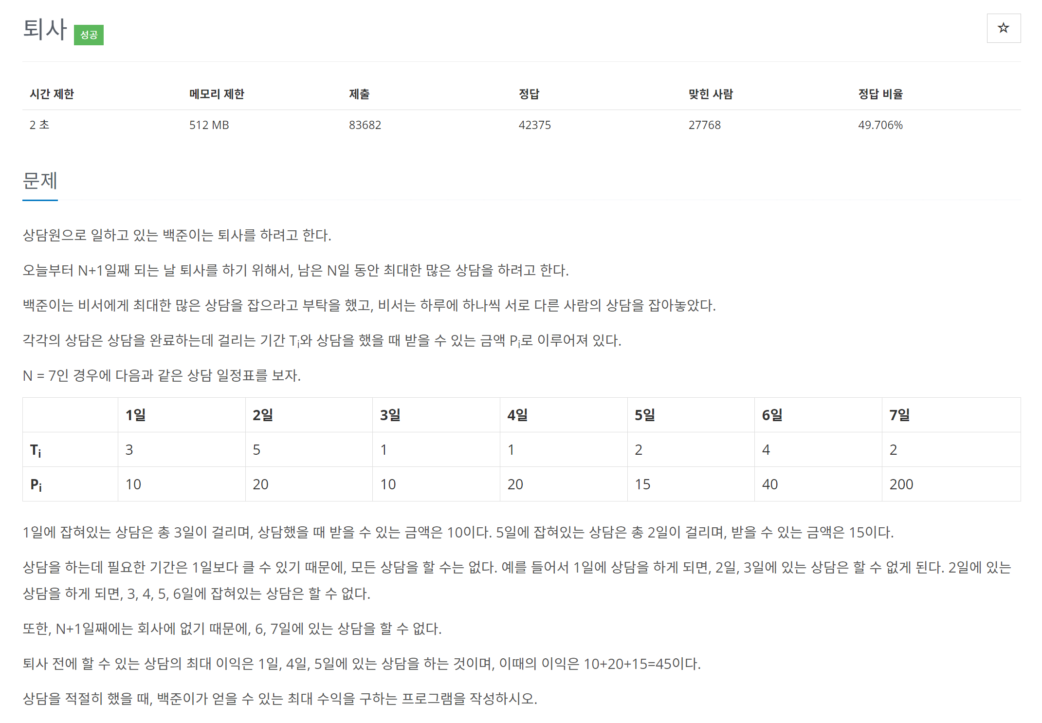 DFS를 이용해 상담을 수락하는 경우는 상담이 끝나는 다음 날로 이동하고, 아닌 경우는 다음 날로 이동하게 코드를 작성했다.