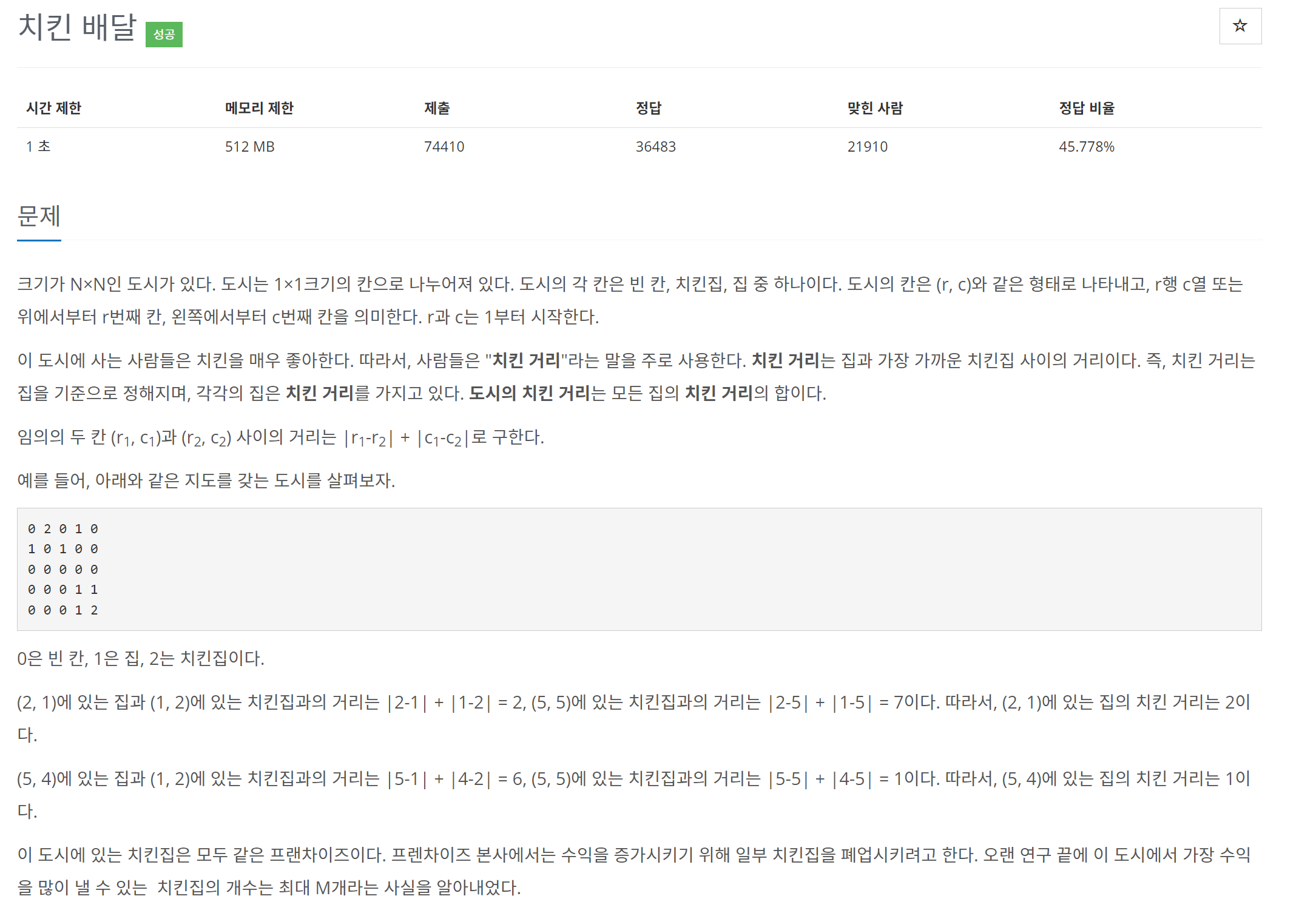 크기가 N×N인 도시가 있다. 도시는 1×1크기의 칸으로 나누어져 있다. 도시의 각 칸은 빈 칸, 치킨집, 집 중 하나이다. 도시의 칸은 (r, c)와 같은 형태로 나타내고, r행 c열 또는 위에서부터 r번째 칸