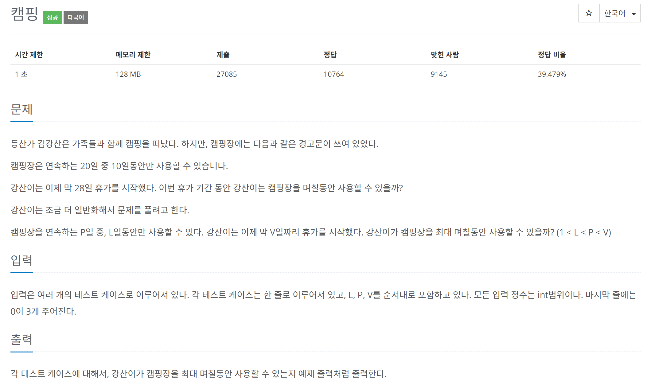 입력은 여러 개의 테스트 케이스로 이루어져 있다. 각 테스트 케이스는 한 줄로 이루어져 있고, L, P, V를 순서대로 포함하고 있다. 모든 입력 정수는 int범위이다. 마지막 줄에는 0이 3개 주어진다.