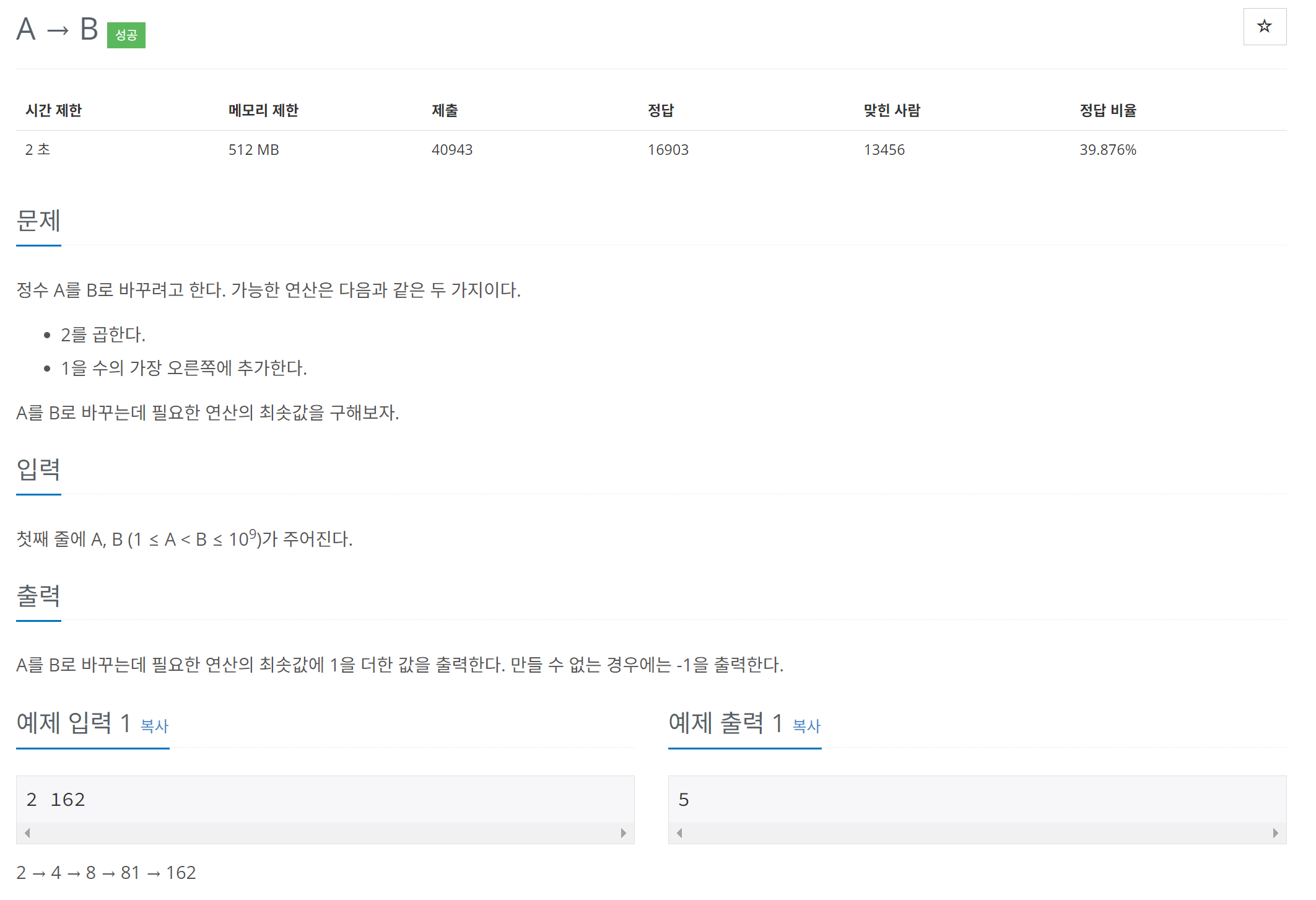 '정수 A를 B로 바꾸려고 한다'라고 문제에 적혀있지만, 저는 B를 A로 만드는 최단경로라고 생각했다.
