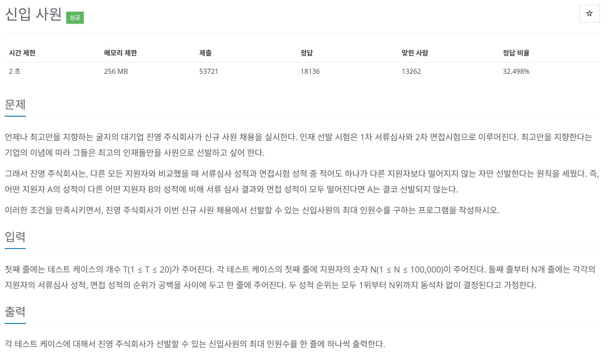일단 서류 심사 결과를 기준으로 정렬한 뒤, 서류심사 결과가 1등인 사람부터의 면접성적을 기준으로 min_value를 설정해 서류심사의 성적이 낮은사람의 면접성적이 min_value 보다 낮으면 count를 하고 min_value를 수정했다.