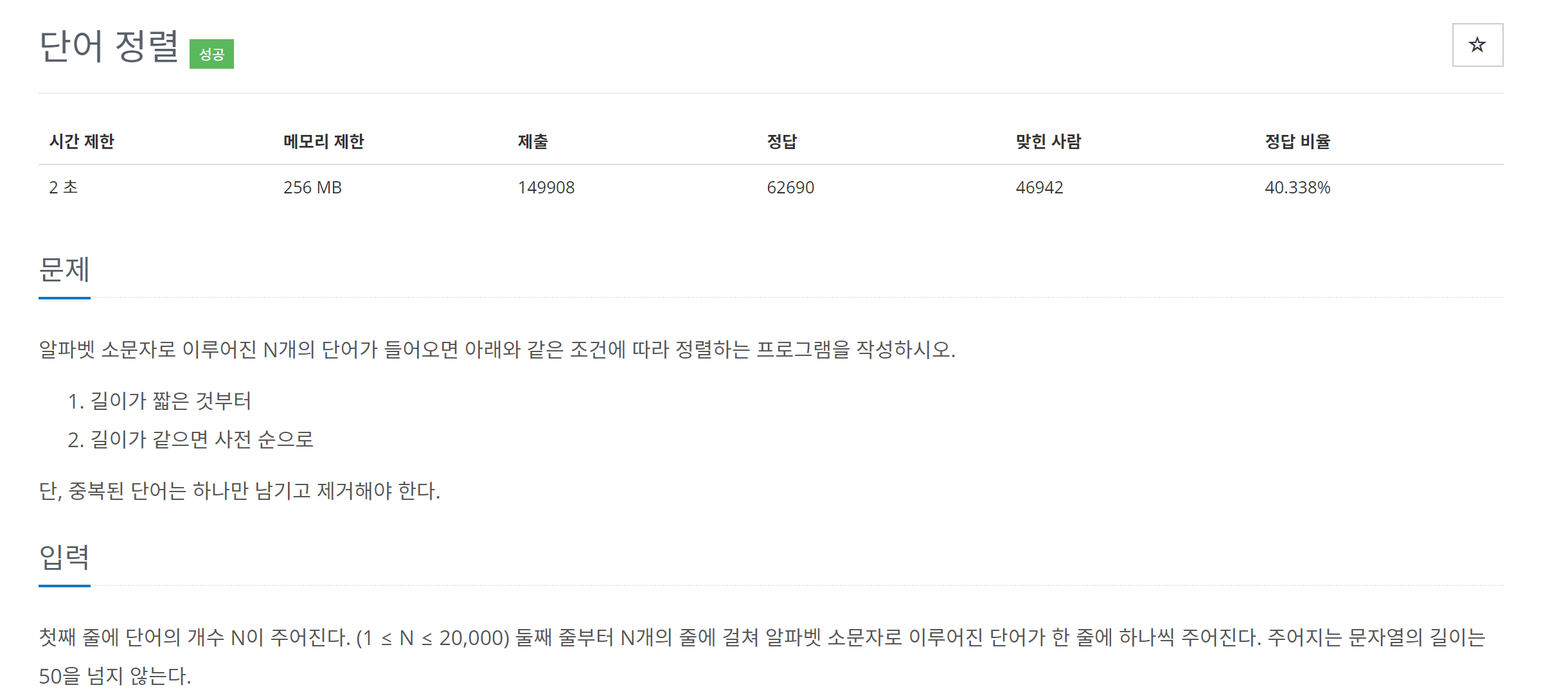 단어의 길이에 따라 정렬하고 길이가 같은 단어들의 비교인 경우에는 string의 compare 함수를 이용해 정렬을 했다.
