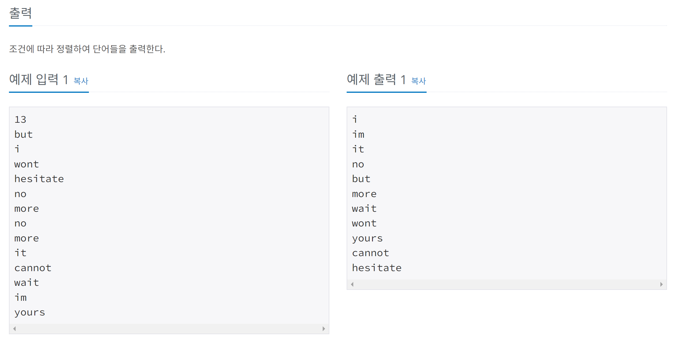 첫째 줄에 단어의 개수 N이 주어진다. (1 ≤ N ≤ 20,000) 둘째 줄부터 N개의 줄에 걸쳐 알파벳 소문자로 이루어진 단어가 한 줄에 하나씩 주어진다. 주어지는 문자열의 길이는 50을 넘지 않는다.