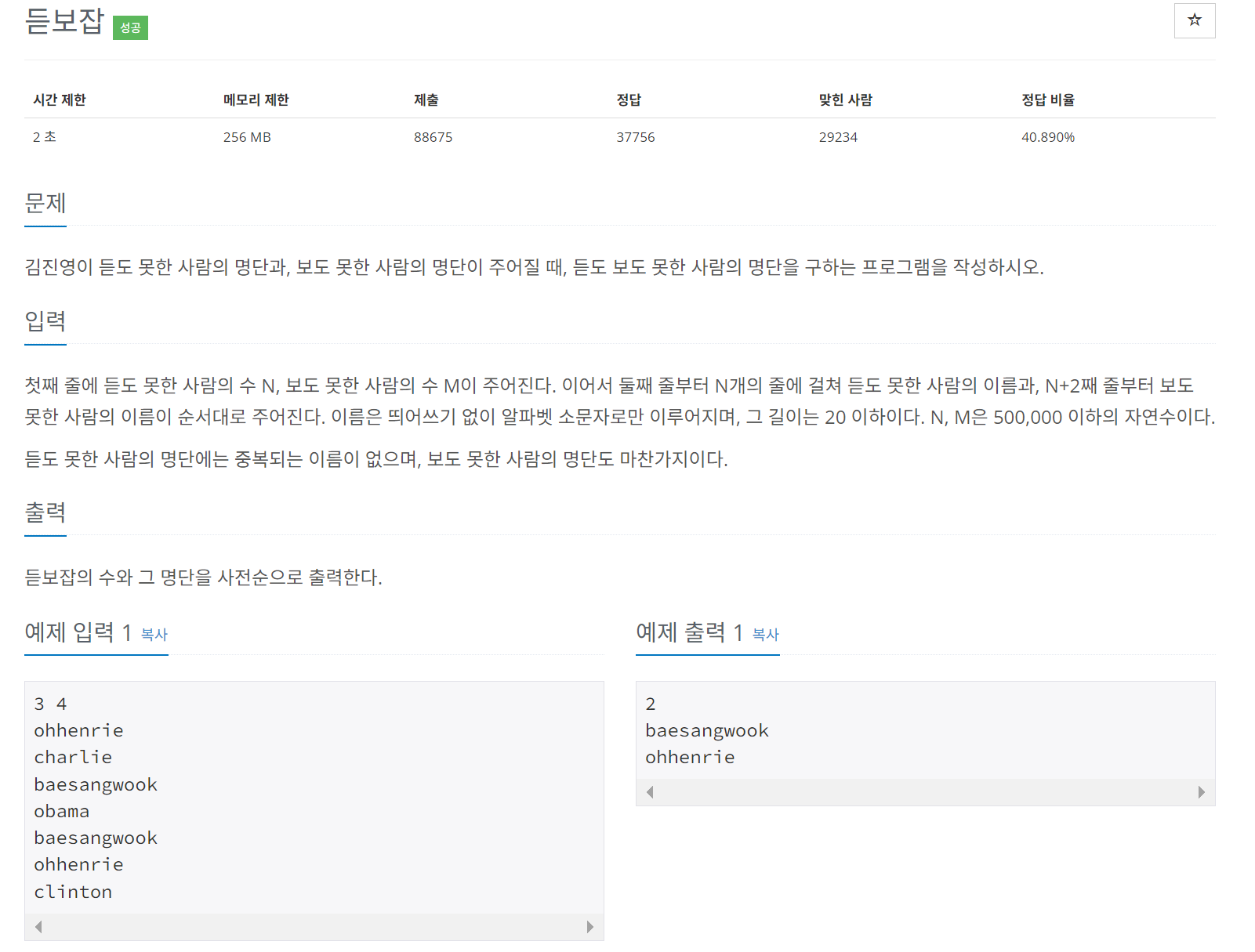 첫째 줄에 듣도 못한 사람의 수 N, 보도 못한 사람의 수 M이 주어진다. 이어서 둘째 줄부터 N개의 줄에 걸쳐 듣도 못한 사람의 이름과, N+2째 줄부터 보도 못한 사람의 이름이 순서대로 주어진다.
