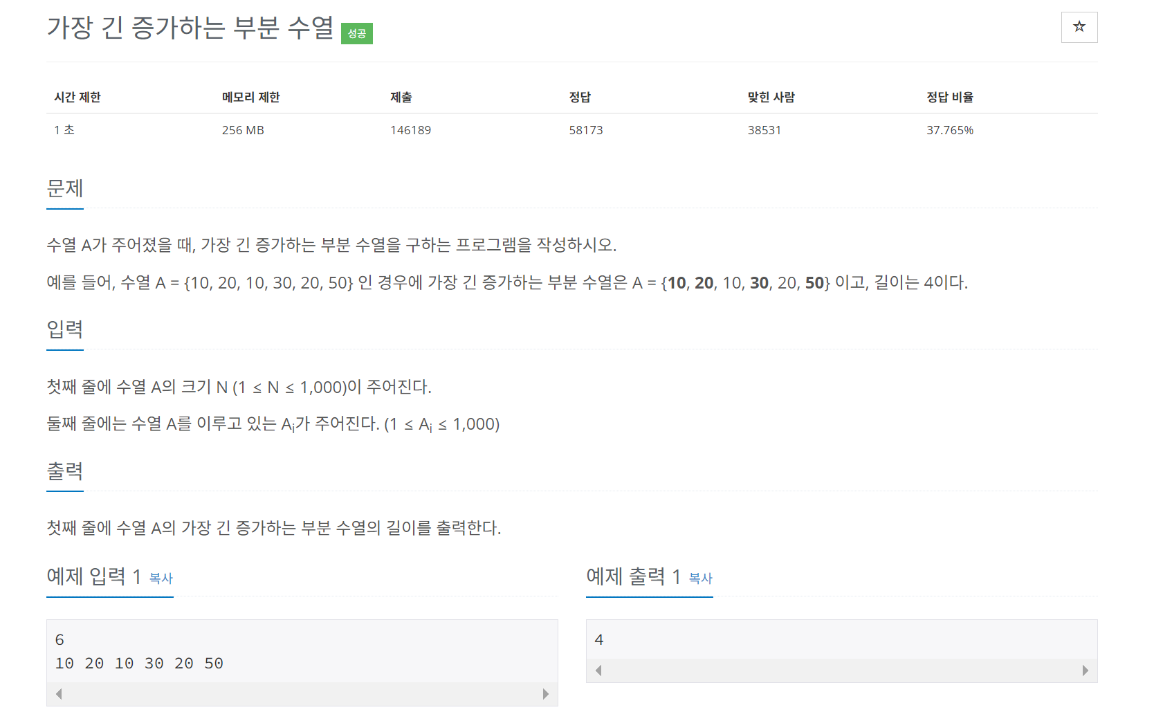 이중 반복문을 이용해 최장 증가하는 부분 수열 값을 구했다.