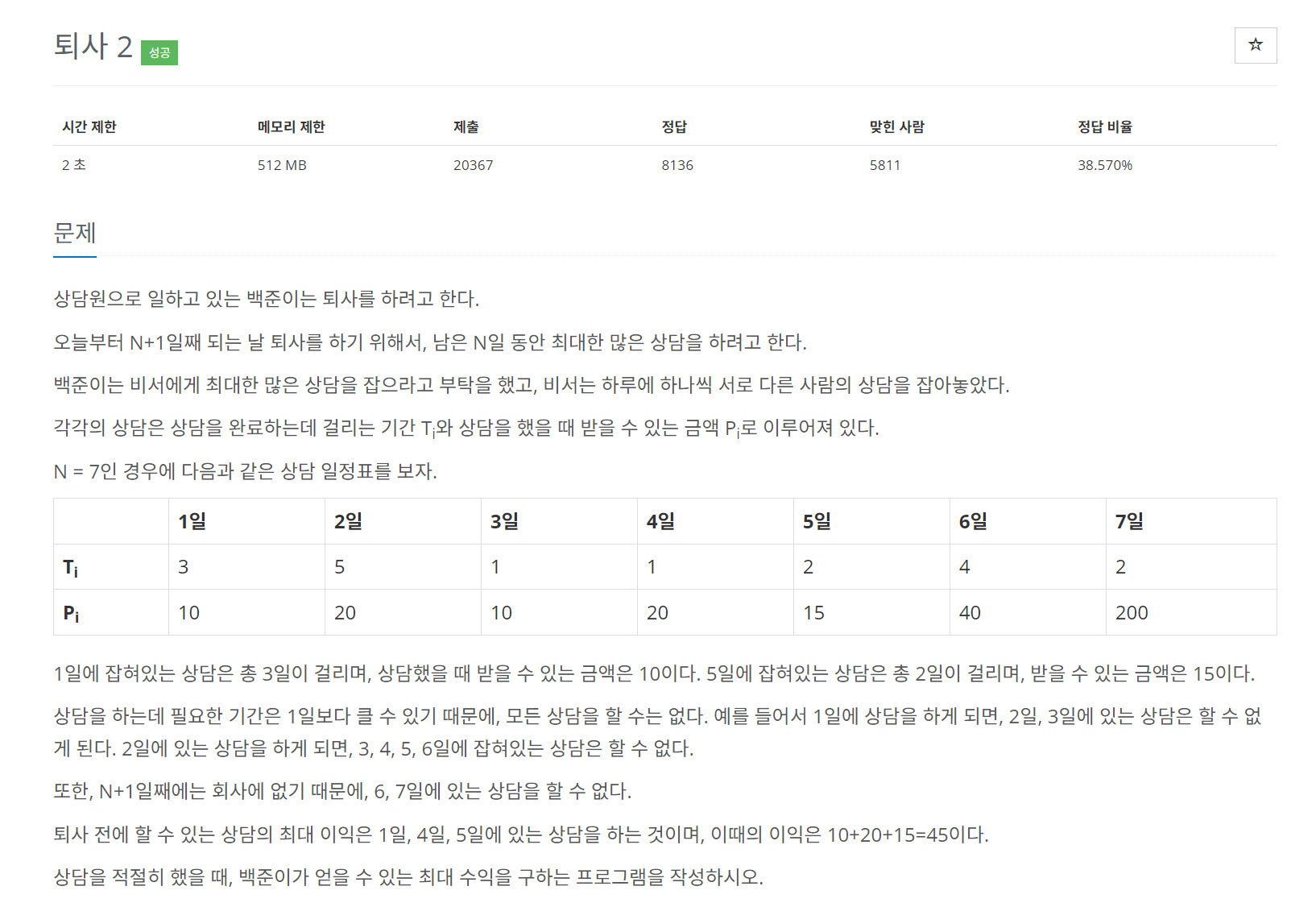 dp[i]에는 i-1날까지 끝낼 수 있는 상담을 통한 최대수익을 저장했다.