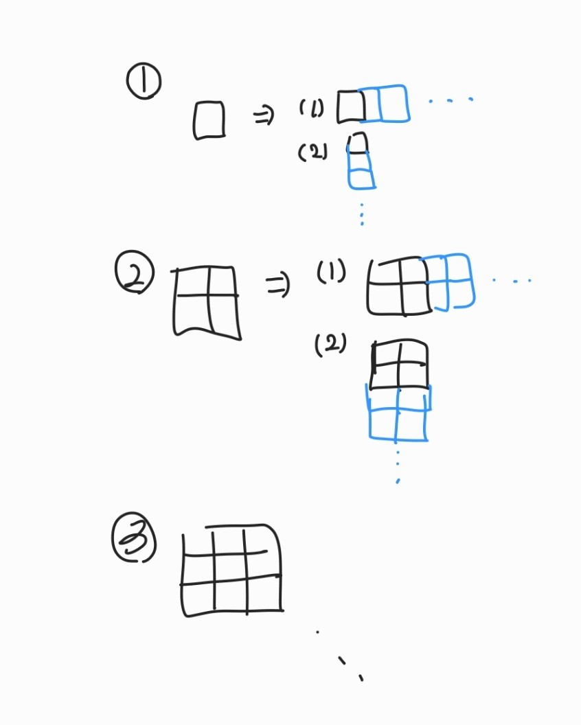 //현재 n x n 행렬에서 (n+1) x (n+1)행렬로 늘린 다음에 다시 탐색