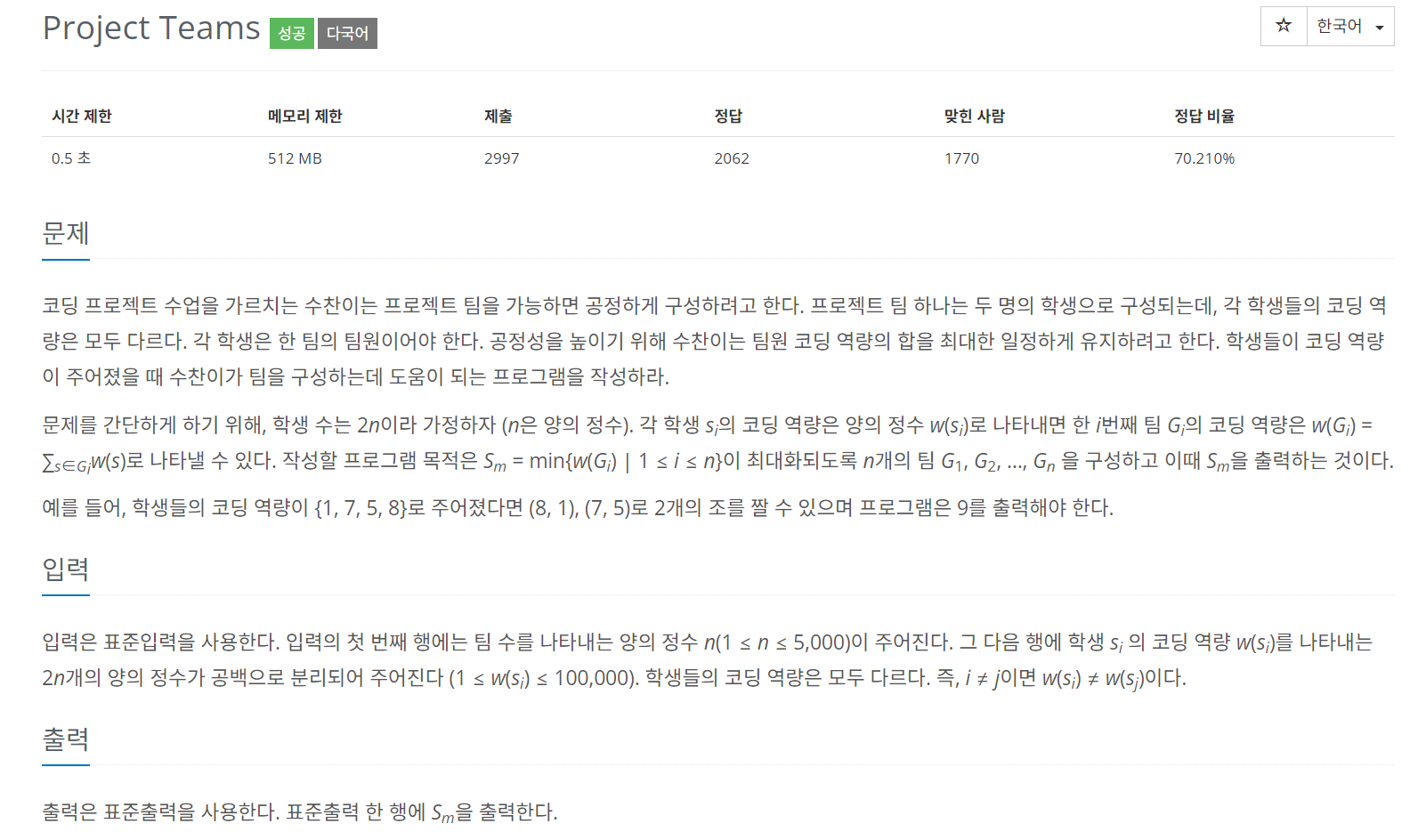 입력은 표준입력을 사용한다. 입력의 첫 번째 행에는 팀 수를 나타내는 양의 정수 n(1 ≤ n ≤ 5,000)이 주어진다. 그 다음 행에 학생 si 의 코딩 역량 w(si)를 나타내는 2n개의 양의 정수가 공백으로
