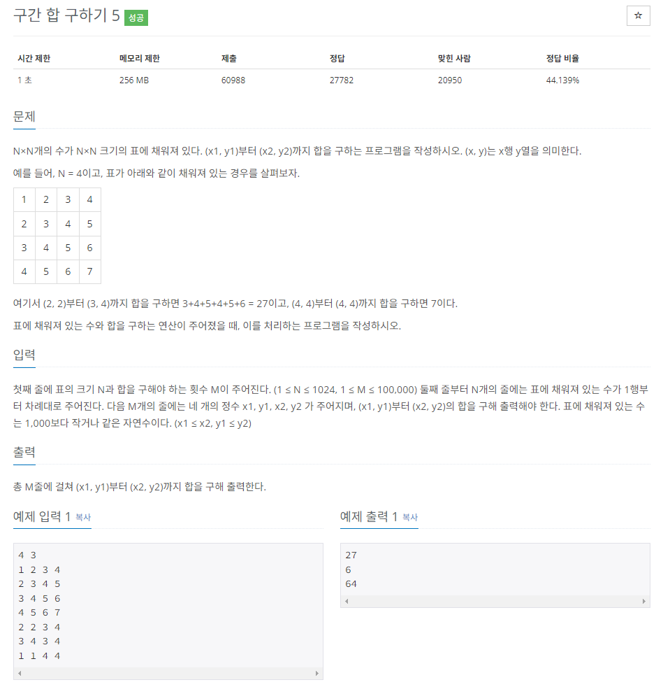 https://www.acmicpc.net/problem/11660 11660번: 구간 합 구하기 5 첫째 줄에 표의 크기 N과 합을 구해야 하는 횟수 M이 주어진다. (1 ≤ N ≤ 1024, 1 ≤ M ≤ 100,000) 둘째 줄부터 N개의 줄에는 표에 채워져 있는 수