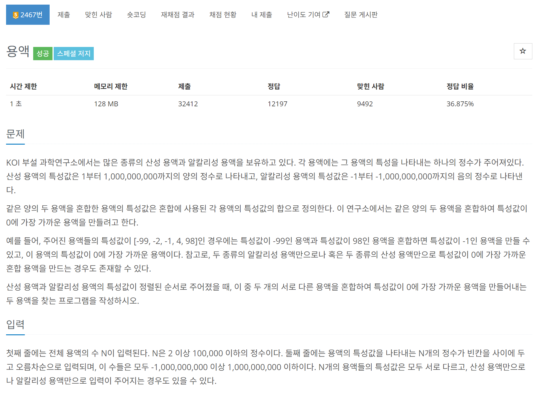 0에 가장 가까운 값을 만드는 2개의 용액을 찾으면 되는 문제이므로 하나의 vector 배열에 모든 값을 저장한다.