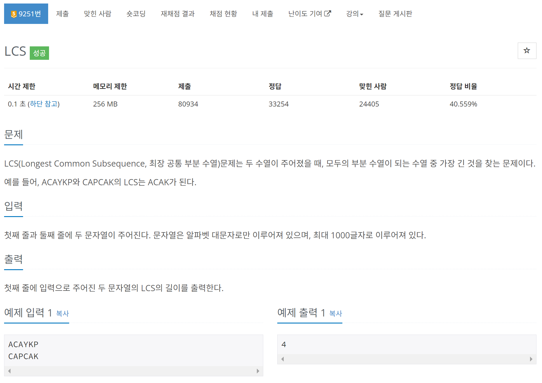 LCS(Longest Common Subsequence, 최장 공통 부분 수열)문제는 두 수열이 주어졌을 때, 모두의 부분 수열이 되는 수열 중 가장 긴 것을 찾는 문제이다. 예를 들어, ACAYKP와 CAPCAK의 LCS는 ACAK가 된다.