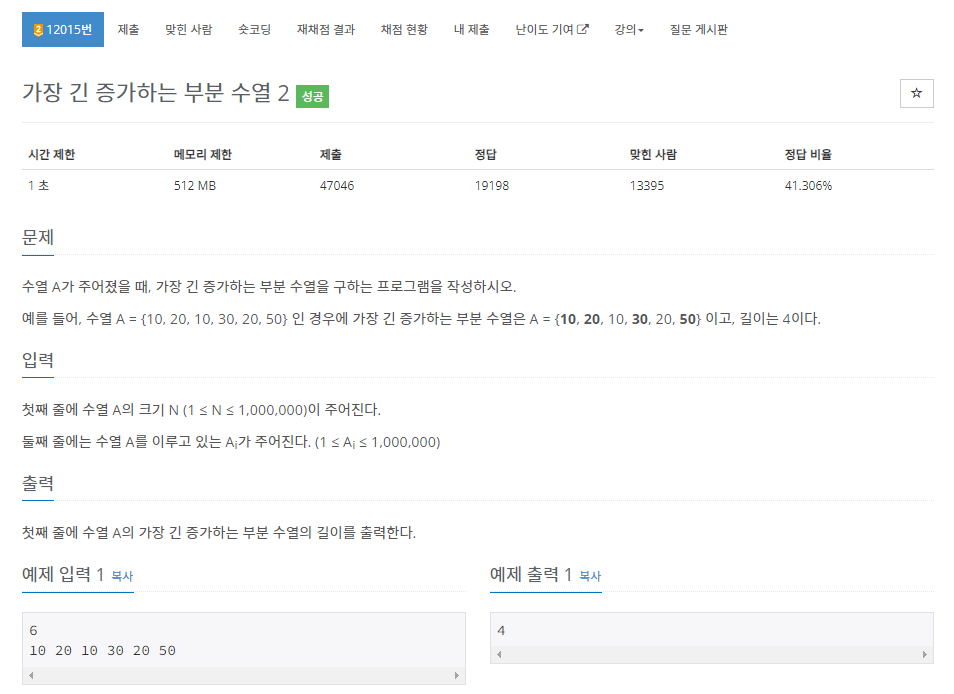 이 문제의 핵심이라고 생각된 점은 가장 긴 증가하는 부분 수열의 "길이"를 출력한다는 점이다.