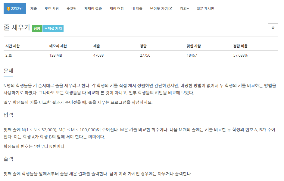 이 문제는 키의 순서가 정해져있을 때, 차례대로 출력하는 문제이므로 위상 정렬을 이용해야함을 알 수 있다.
