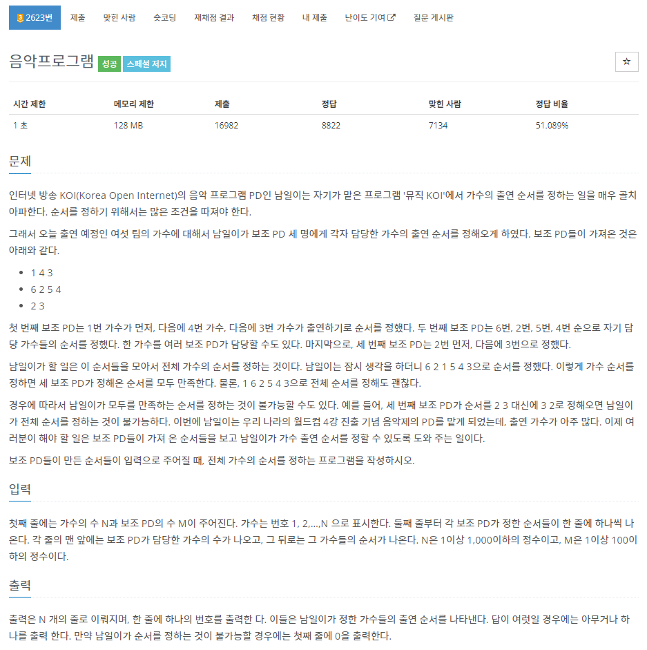 첫째 줄에는 가수의 수 N과 보조 PD의 수 M이 주어진다. 가수는 번호 1, 2,…,N 으로 표시한다. 둘째 줄부터 각 보조 PD가 정한 순서들이 한 줄에 하나씩 나온다. 각 줄의 맨 앞에는 보조 PD가 담당한