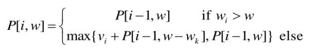 위의 식 P[i,w] 는 아이템이 i개있고, w까지 한도일 때 최적의 v를 구하는 공식이다.