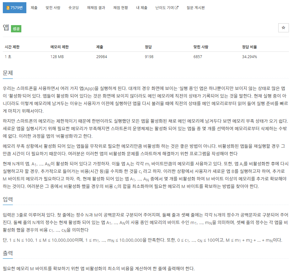 맨 처음에는 그리디로 그냥 cost가 작을수록, cost가 같다면 메모리가 클수록 앞으로 배치되게 정렬한 후 풀었더니 틀렸다.
