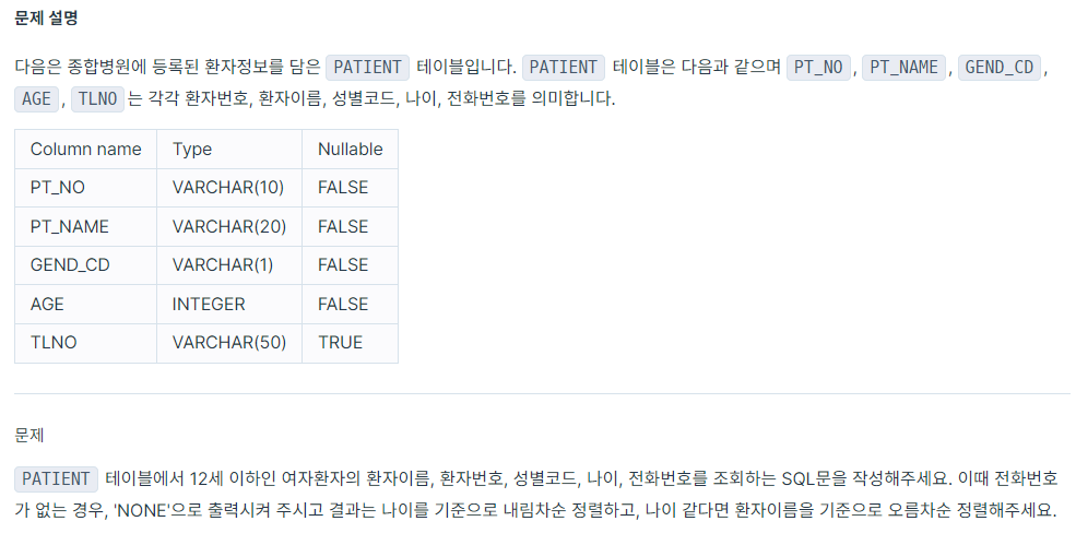 조건 3 : 나이를 기준으로 내림차순 정렬하고, 나이 같다면 환자이름을 기준으로 오름차순 정렬