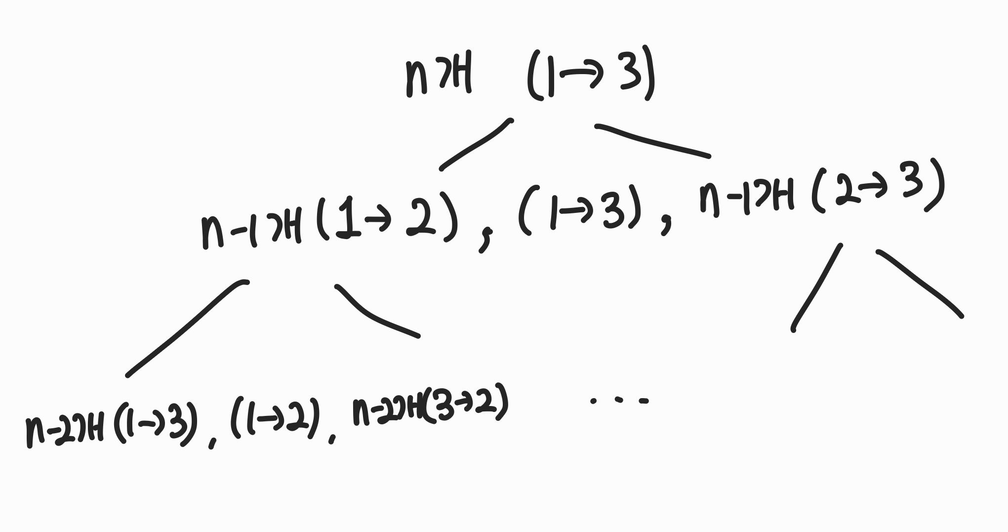 n-1개의 원판을 (1 -> 2) 로 옮기고, 마지막 원판을 (1->3) ,n-1개 원판을 (2->3)으로 옮기면 된다.