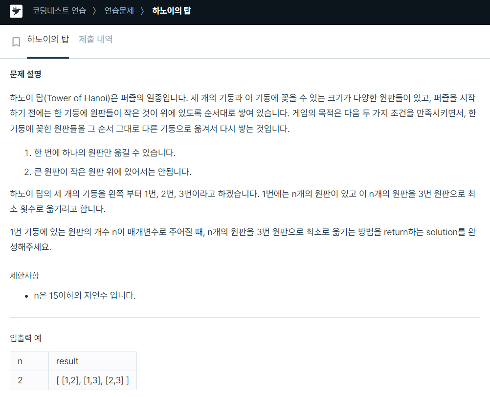하노이의 탑 문제는 n개의 원판을 1번 기둥에서 3번 기둥으로 옮기는 문제이다.