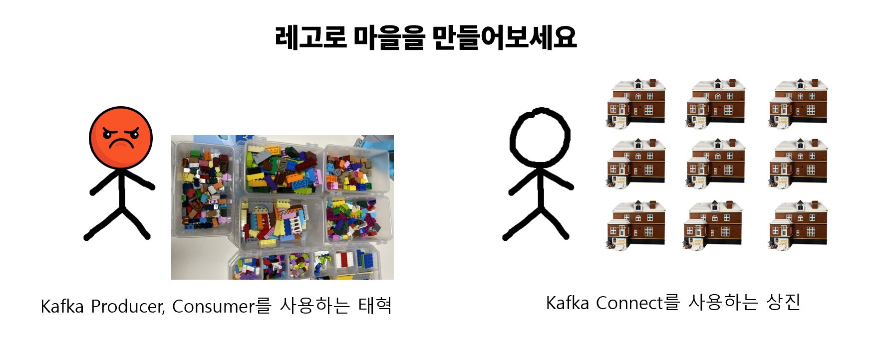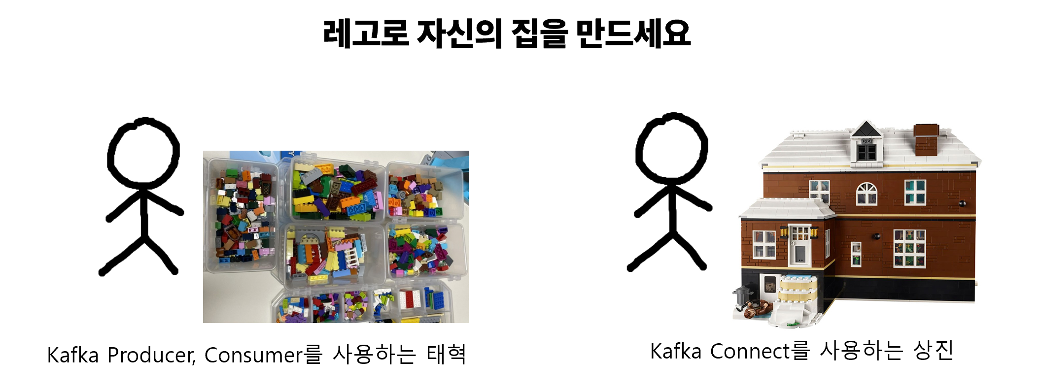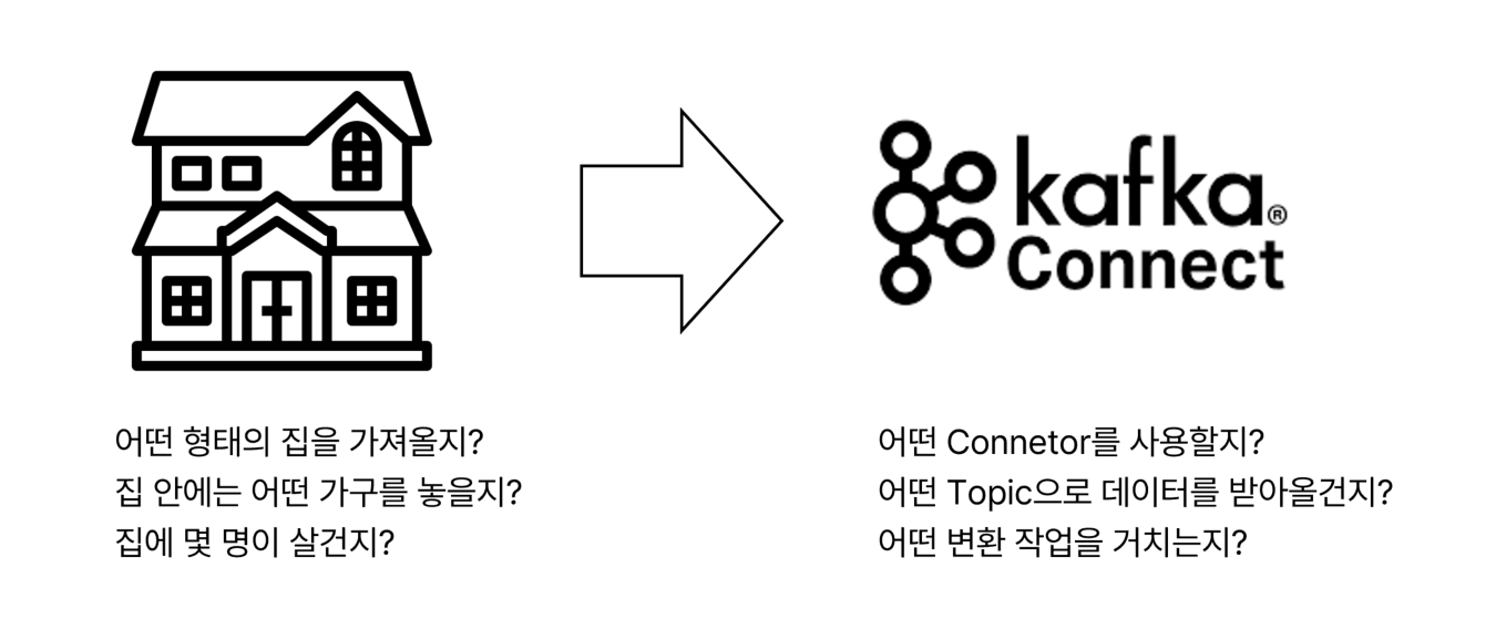 - 위의 집처럼 Kafka Connect는 미리 정의된 Connector 템플릿을 통해 자신이 원하는 환경설정만 적어주기만 하면 반복적인 파이프라인을 쉽게 작성할 수 있음